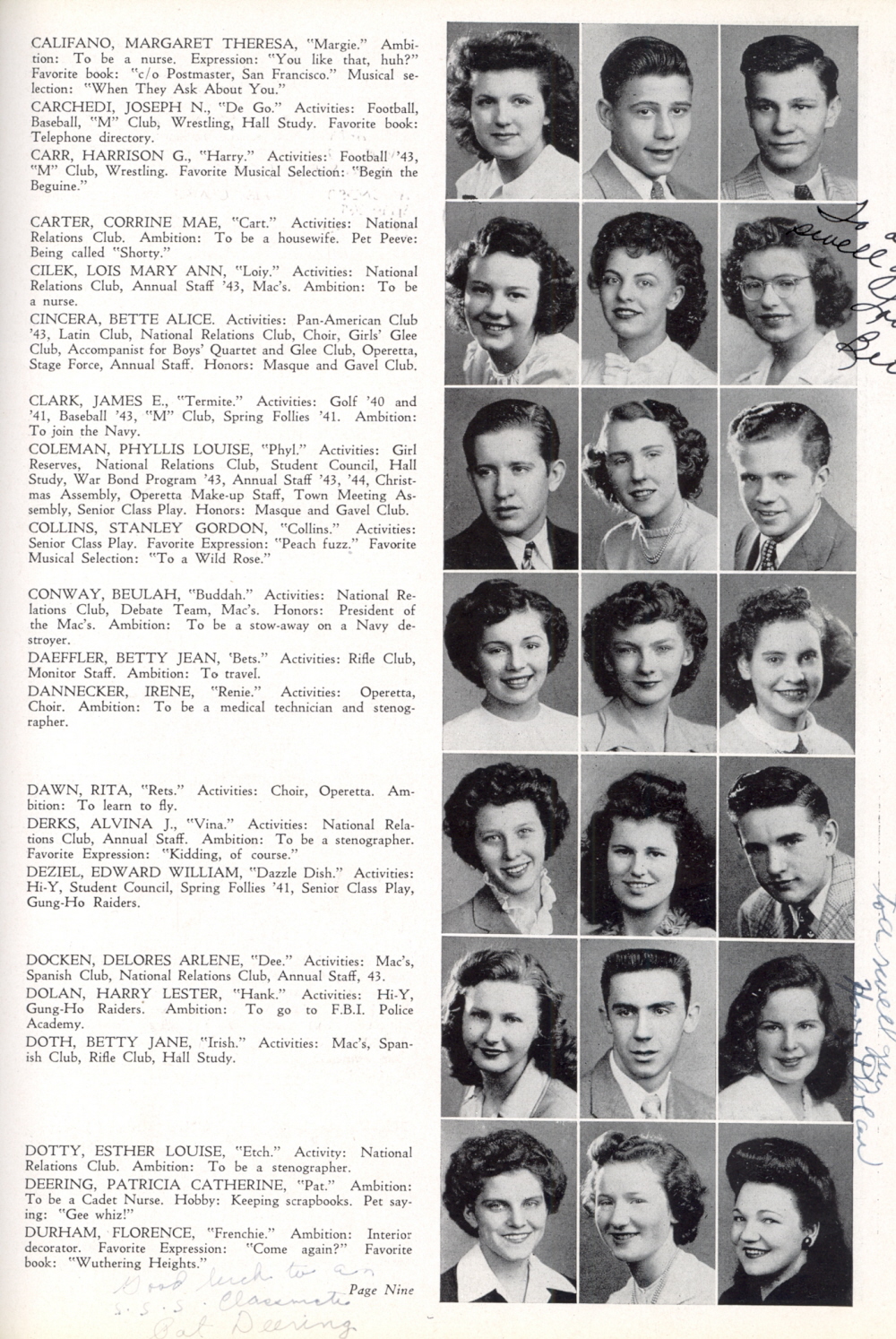 1944 Monroe High School, Page 9: Margaret Theresa Califano, Joseph N. Carchedi, Harrison G. Carr, Corrine Mae Carter, Lois Mary Ann Cilek, Bette Alice Cincera, James E. Clark, Phyllis Louise Coleman, Stanley Gordon Collins, Beulah Conway, Betty Jean Daeffler, Irene Dannecker, Rita Dawn, Alvina J. Derks, Edward William Deziel, Delores Arlene Docken, Harry Lester Dolan, Betty Jane Doth, Esther Louise Dotty, Patricia Catherine Deering, Florence Durham.
