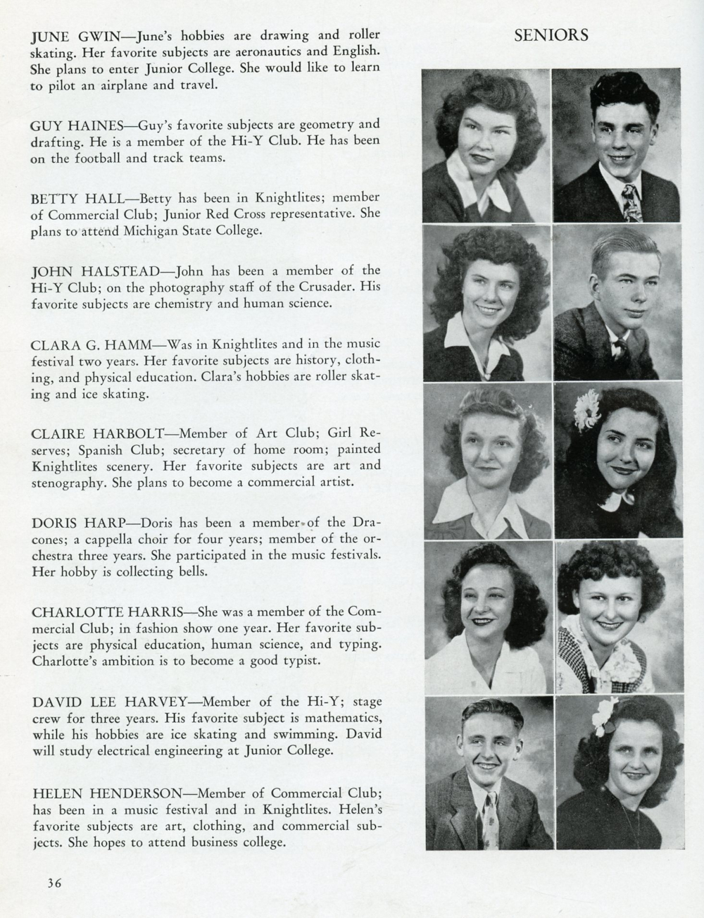 1945 Southeast High School, Page 36: June Gwin, Guy Haines, Betty Hall, John Halstead, Clara G. Hamm, Claire Harbolt, Doris Harp, Charlotte Harris, David Lee Harvey, Helen Henderson.