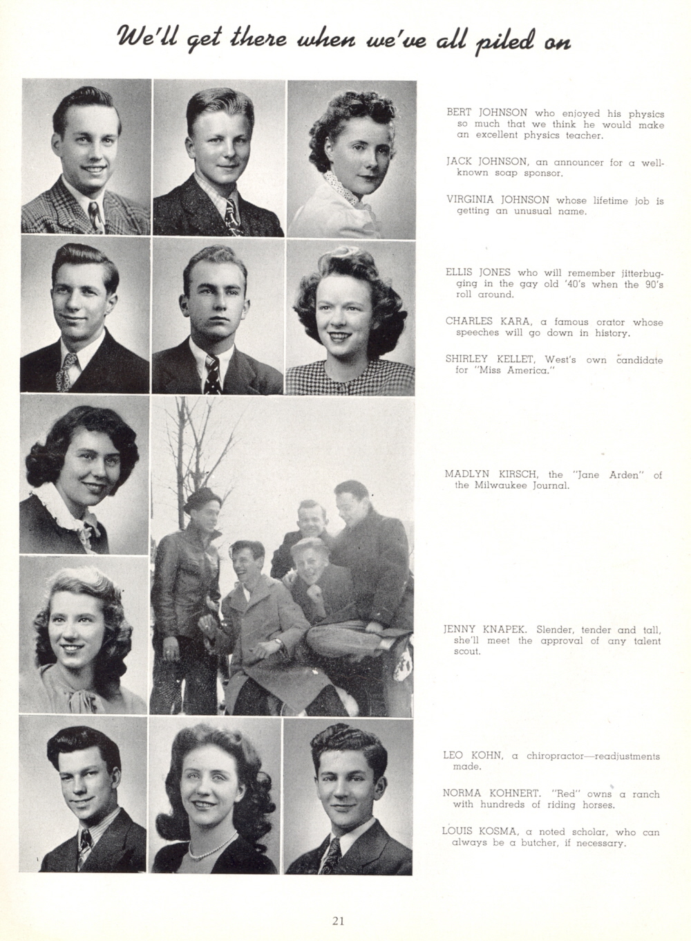 1945 Milwaukee West Division High School, Page 21: Bert Johnson, Jack Johnson, Virginia Johnson, Ellis Jones, Charles Kara, Shirley Kellet, Madlyn Kirsch, Jenny Knapek, Leo Kohn, Norma Kohnert, Louis Kosma.