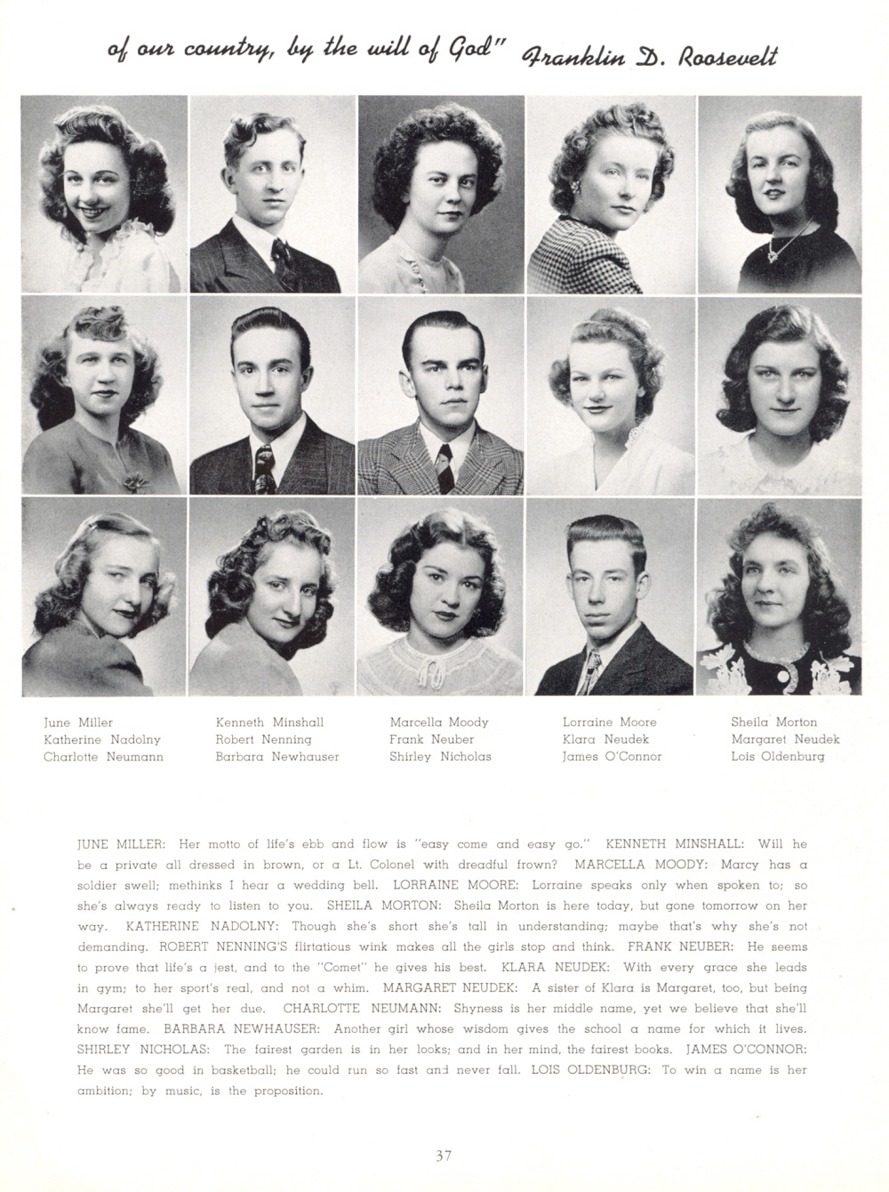 1945 Milwaukee West Division High School, Page 37: June Miller, Kenneth Minshall, Marcella Moody, Lorraine Moore, Sheila Morton, Katherine Nadolny, Robert Nenning, Frank Neuber, Klara Neudek, Margaret Neudek, Charlotte Neumann, Barbara Newhauser, Shirley Nicholas, James O'Connor, Lois Oldenburg.