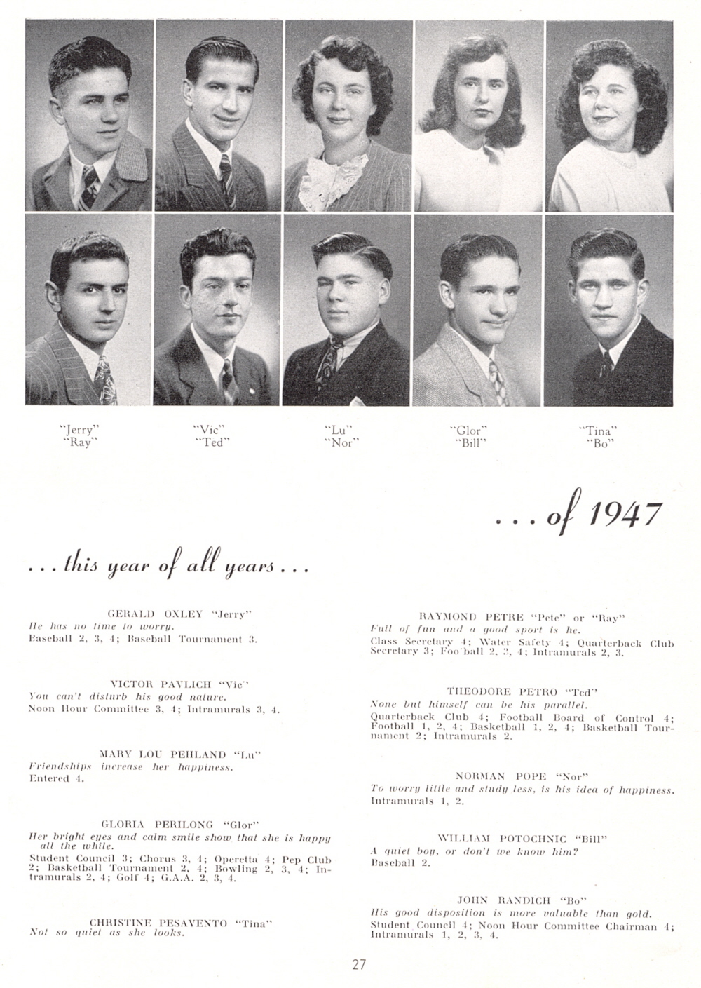 1947 Lockport High School, Page 27: Gerald Oxley, Victor Pavlich, Mary Lou Pehland, Gloria Perilong, Christine Pesavento, Raymond Petre, Theodore Petro, Norman Pope, William Potochnic, John Randich.
