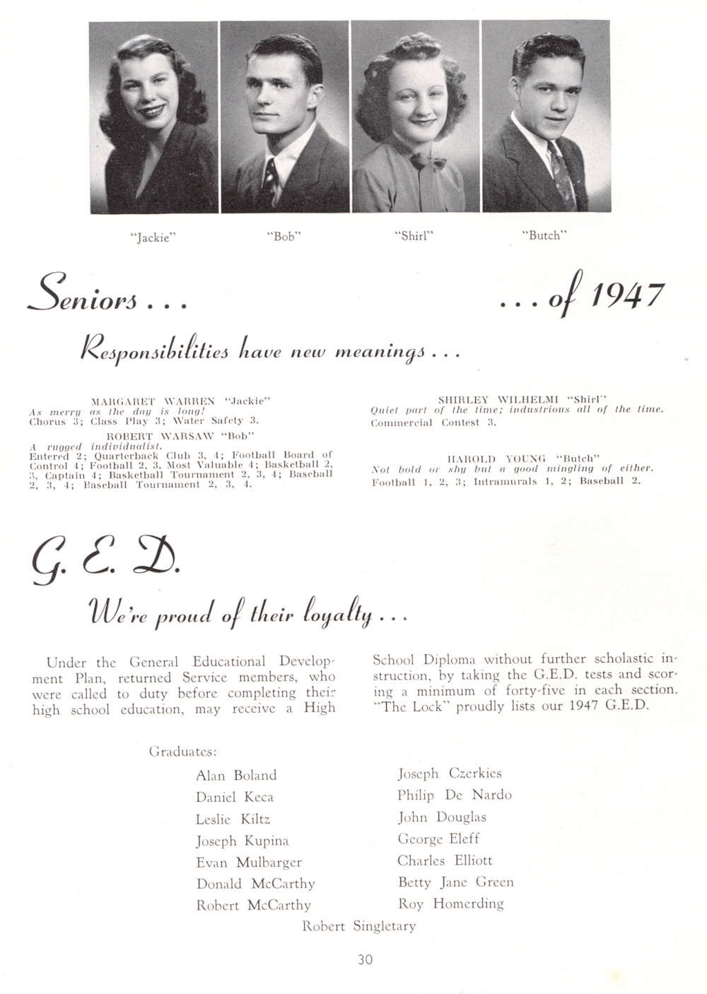 1947 Lockport High School, Page 30: Margaret Warren, Robert Warsaw, Shirley Wilhelmi, Harold Young, Alan Boland, Daniel Keca, Leslie Kiltz, Joseph Kupina, Evan Mulbarger, Donald McCarthy, Robert McCarthy, Joseph Czerkies, Philip De Nardo, John Douglas, George Eleff, Charles Elliott, Betty Jane Green, Roy Homerding, Robert Singletary.