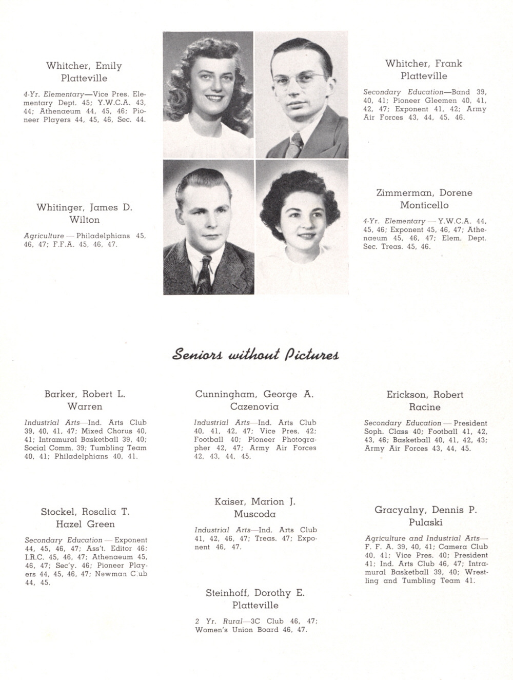 1947 Platteville State Teachers College, 1947 Class, Page 18: Emily Whitcher, Frank Whitcher, James D. Whitinger, Dorene Zimmerman, Robert L. Barker, George A. Cunningham, Robert Erickson, Rosalia T. Stockel, Marion J. Kaiser, Dennis P. Gracyalny, Dorothy E. Steinhoff.