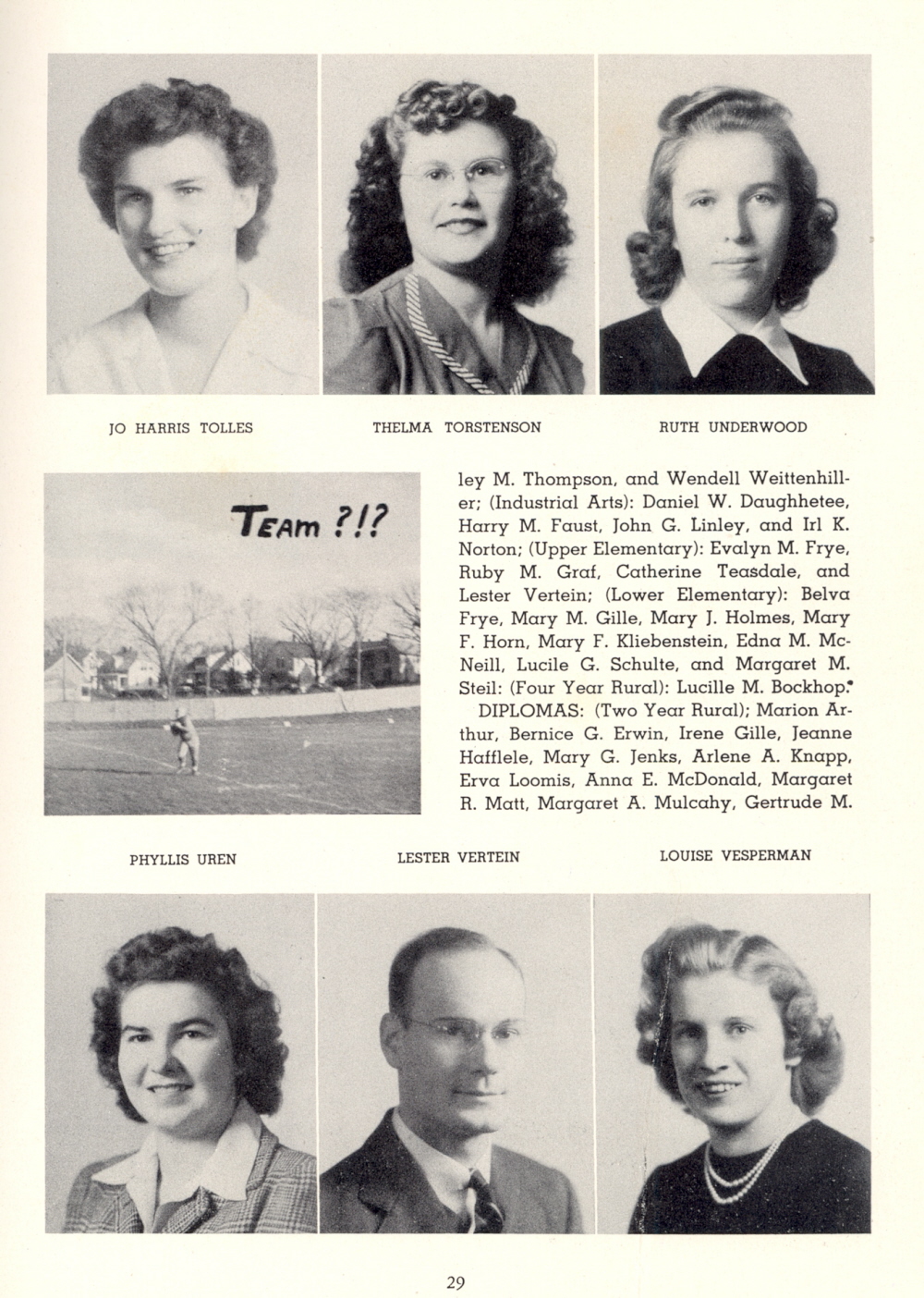 1947 Platteville State Teachers College, 1943 Class, Page 29: Jo Harris Tolles, Thelma Torstenson, Ruth Underwood, Phyllis Uren, Lester Vertein, Louise Vesperman.