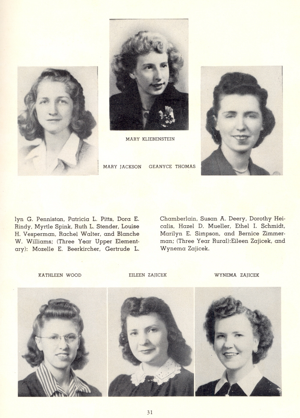 1947 Platteville State Teachers College, 1943 Class, Page 31: Mary Kliebenstein, Mary Jackson, Geanyce Thomas, Kathleen Wood, Eileen Zajicek, Wynema Zajicek.