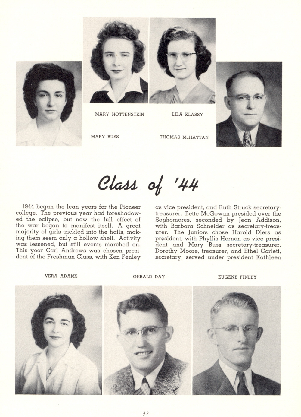 1947 Platteville State Teachers College, 1944 Class, Page 32: Mary Hottenstein, Lila Klassy, Mary Russ, Thomas McHatten, Vera Adams, Gerald Day, Eugene Finley.