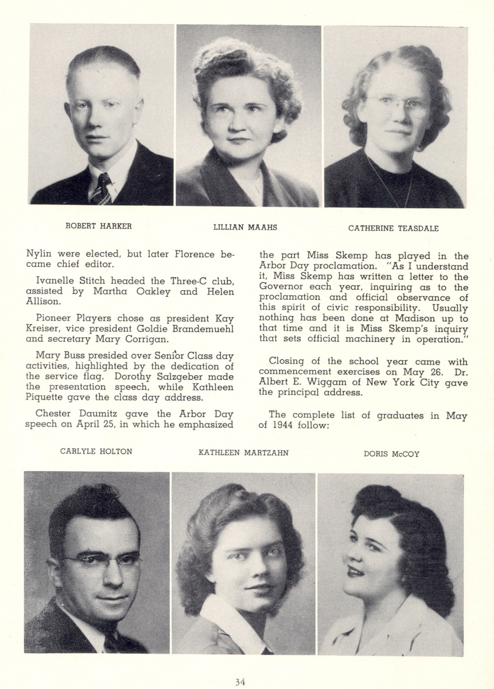 1947 Platteville State Teachers College, 1944 Class, Page 34: Robert Harker, Lillian Maahs, Catherine Teasdale, Carlyle Holton, Kathleen Martzahn, Doris McCoy.