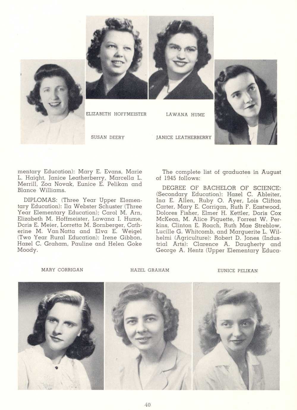 1947 Platteville State Teachers College, 1945 Class, Page 40: Elizabeth Hoffmeister, Lawana Hume, Susan Deery, Janice Leatherberry, Mary Corrigan, Hazel Graham, Eunice Pelikan.