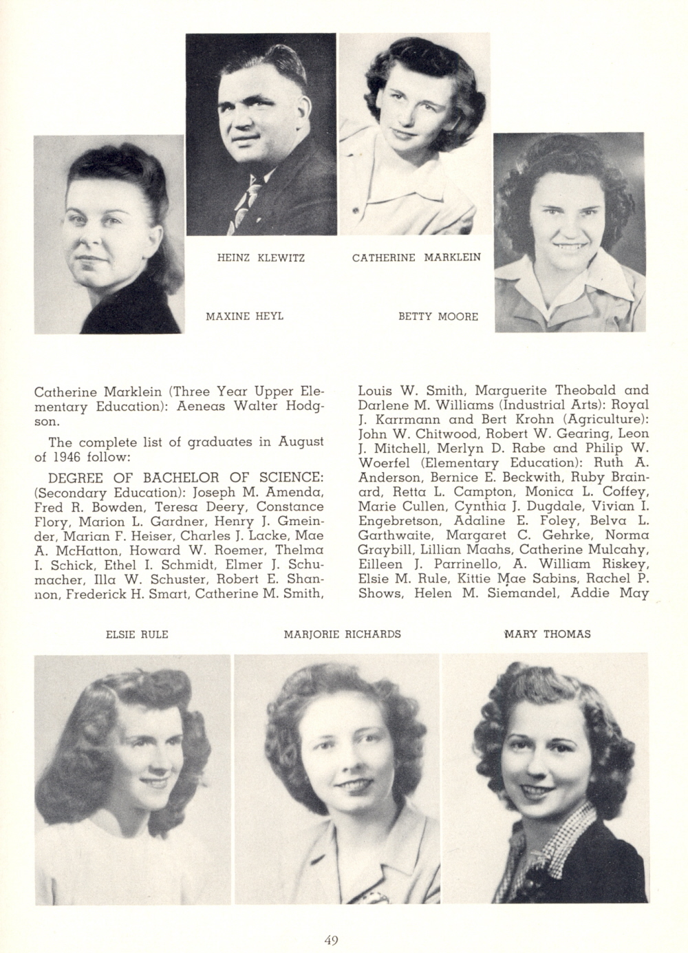 1947 Platteville State Teachers College, 1946 Class, Page 49: Maxine Heyl, Heinz Klewitz, Catherine Marklein, Betty Moore, Elsie Rule, Marjorie Richards, Mary Thomas.