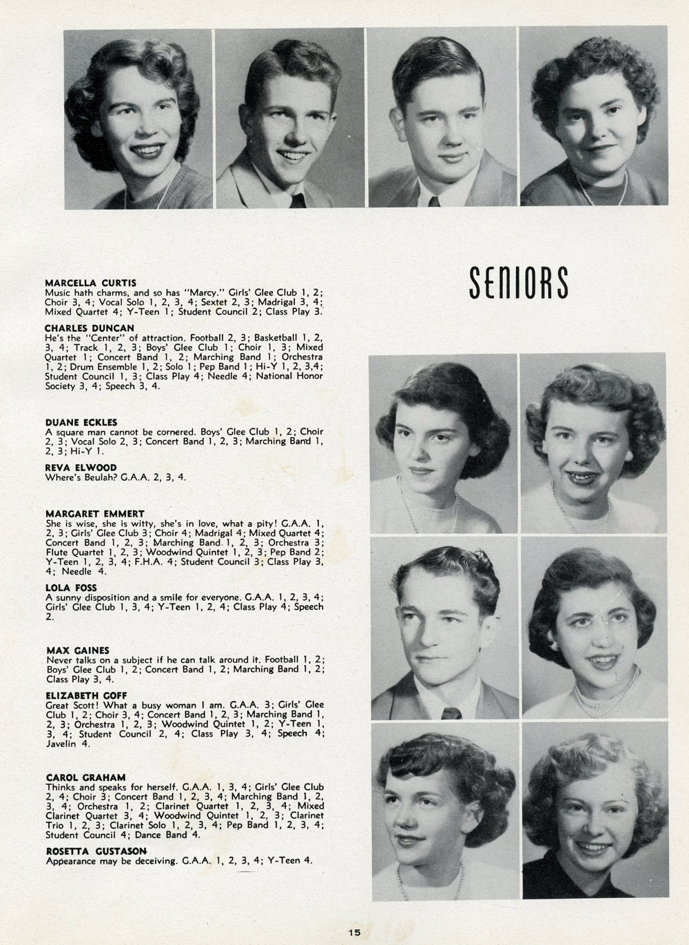 1951 Atlantic High School, Page 15: Marcella Curtis, Charles Duncan, Duane Eckles, Reva Elwood, Margaret Emmert, Lola Foss, Max Gaines, Elizabeth Goff, Carol Graham, Rosetta Gustason.