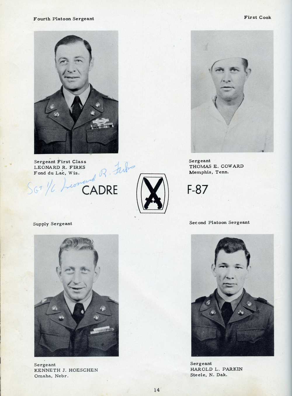 1951 Fort Riley Kansas 10th Infantry Division, Page 14: Sergeant First Class Leonard R. Firks, Sergeant Thomas E. Coward, Sergeant Kenneth J. Hoeschen, Sergeant Harold L. Parkin.