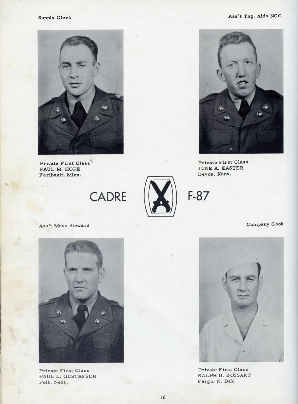 1951 Fort Riley Kansas 10th Infantry Division, Page 16: Private First Class Paul M. Hope, Private First Class June A. Easter, Private First Class Paul L. Gustafson, Private First Class Ralph D. Bossart.