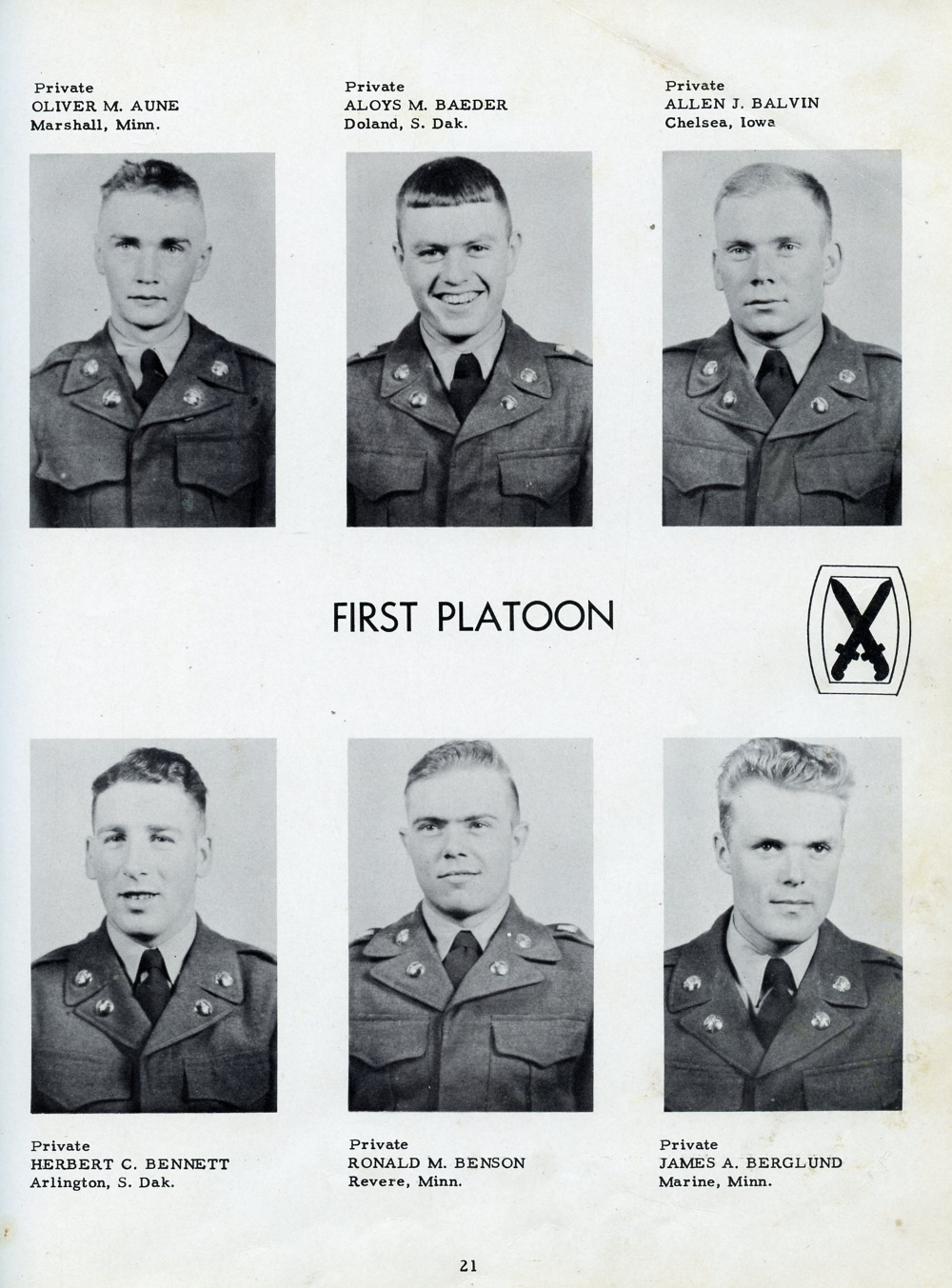 1951 Fort Riley Kansas 10th Infantry Division Company F 87th Infantry, Page 21: Oliver M. Aune, Aloys M. Baeder, Allen J. Balvin, Herbert C. Bennett, Ronald M. Benson, James A. Berglund.