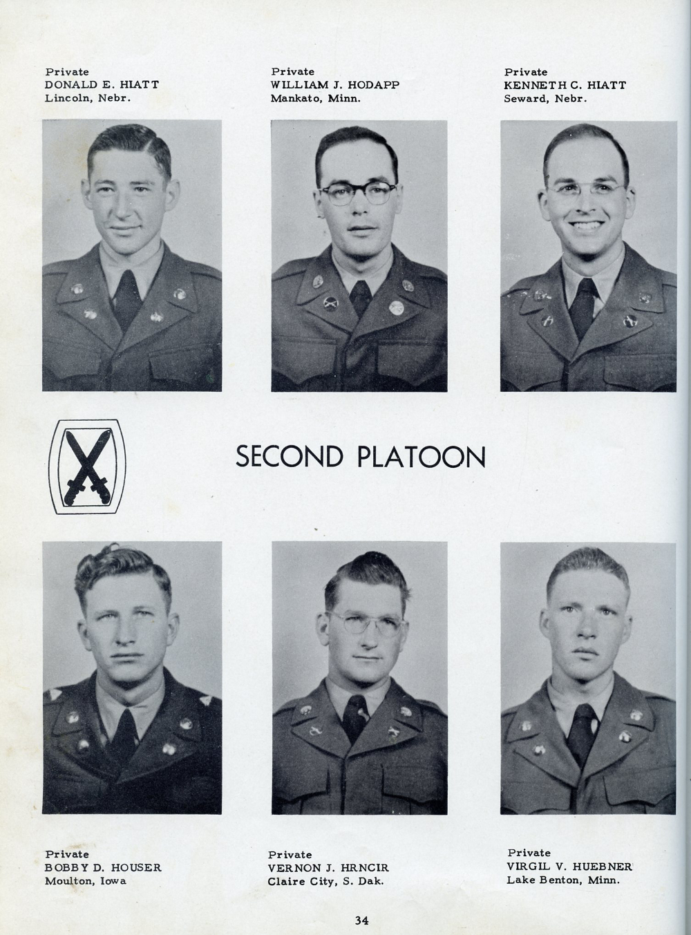 1951 Fort Riley Kansas 10th Infantry Division Company F 87th Infantry, Page 34: Donald E. Hiatt, William J. Hodapp, Kenneth C. Hiatt, Bobby D. Houser, Vernon J. Hrncir, Virgil V. Huebner.