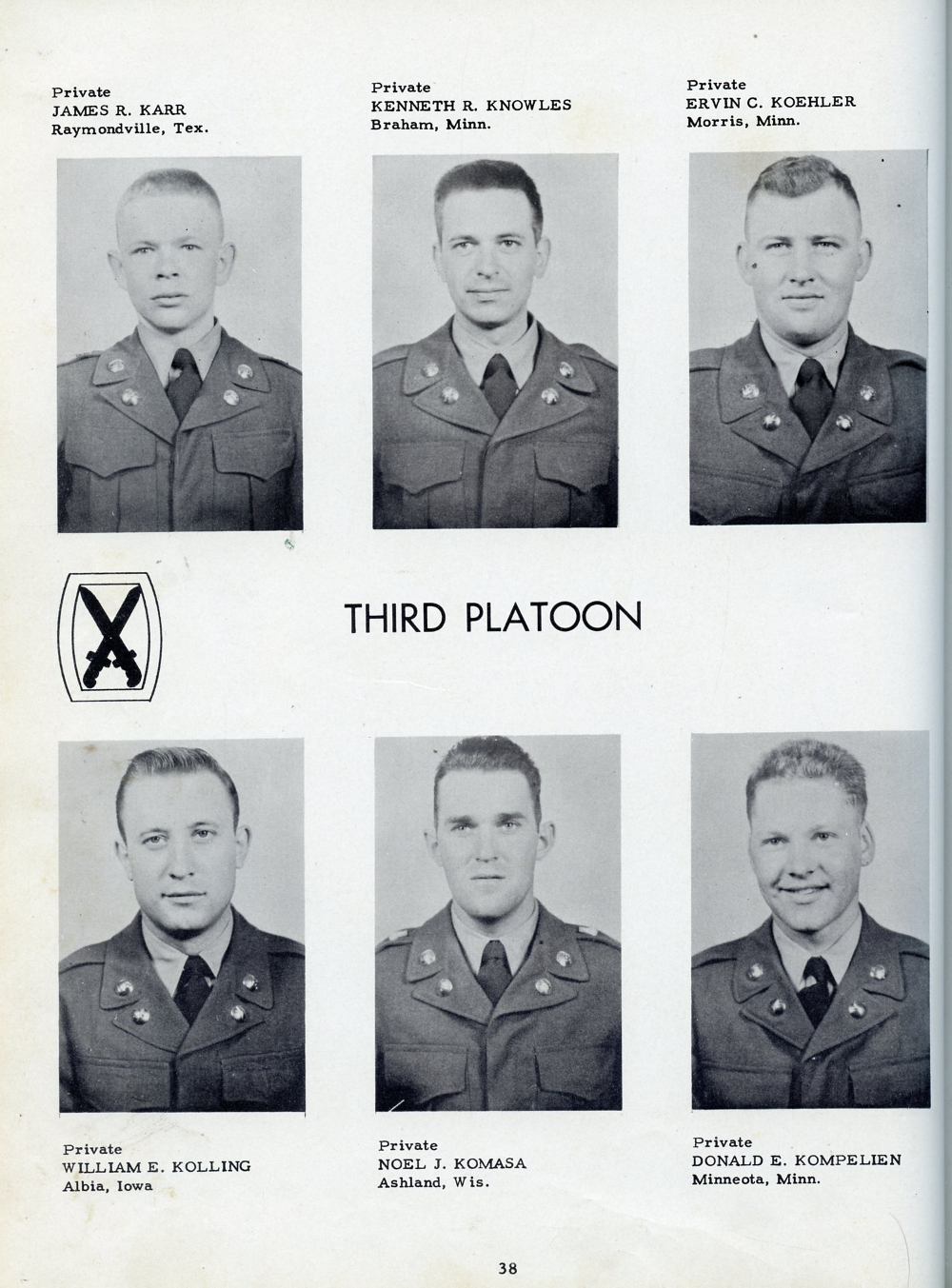 1951 Fort Riley Kansas 10th Infantry Division Company F 87th Infantry, Page 38: James R. Karr, Kenneth R. Knowles, Ervin C. Koehler, William E. Kolling, Noel J. Komasa, Donald E. Kompelien.