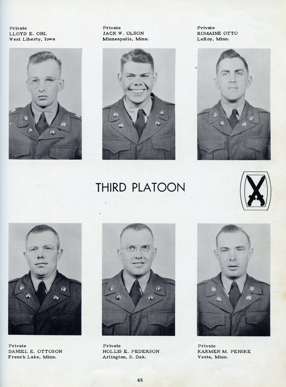 1951 Fort Riley Kansas 10th Infantry Division Company F 87th Infantry, Page 45: Lloyd E. Ohl, Jack W. Olson, Romaine Otto, Daniel E. Ottoson, Hollis E. Pederson, Karmen M. Penske.