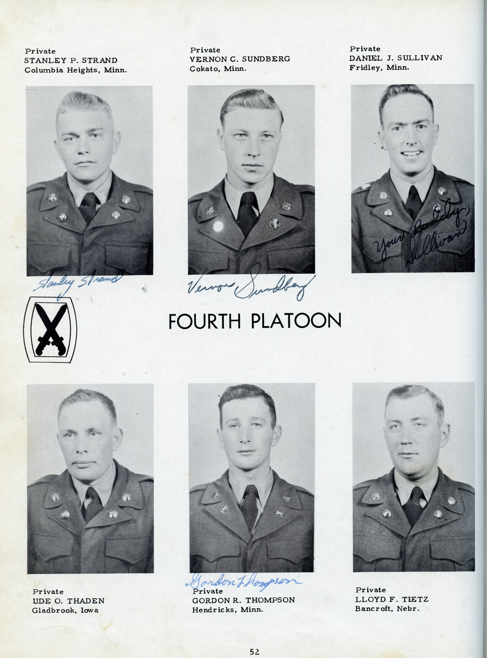 1951 Fort Riley Kansas 10th Infantry Division Company F 87th Infantry, Page 52: Stanley P. Strand, Vernon C. Sundberg, Daniel J. Sullivan, Ude O. Thaden, Gordon R. Thompson, Lloyd F. Tietz.
