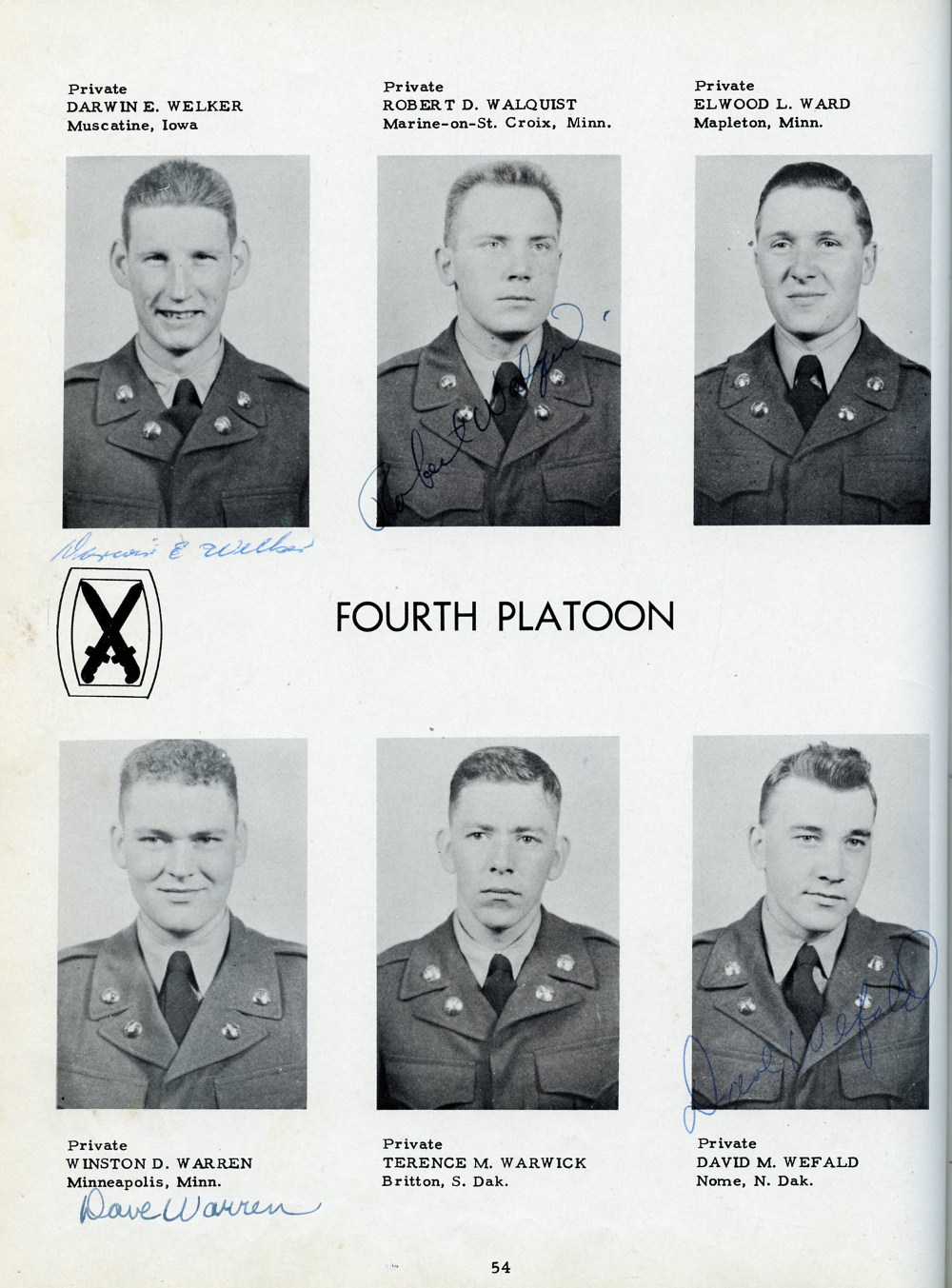 1951 Fort Riley Kansas 10th Infantry Division Company F 87th Infantry, Page 54: Darwin E. Welker, Robert D. Walquist, Elwood L. Ward, Winston D. Warren, Terence M. Warwick, David M. Wefald.