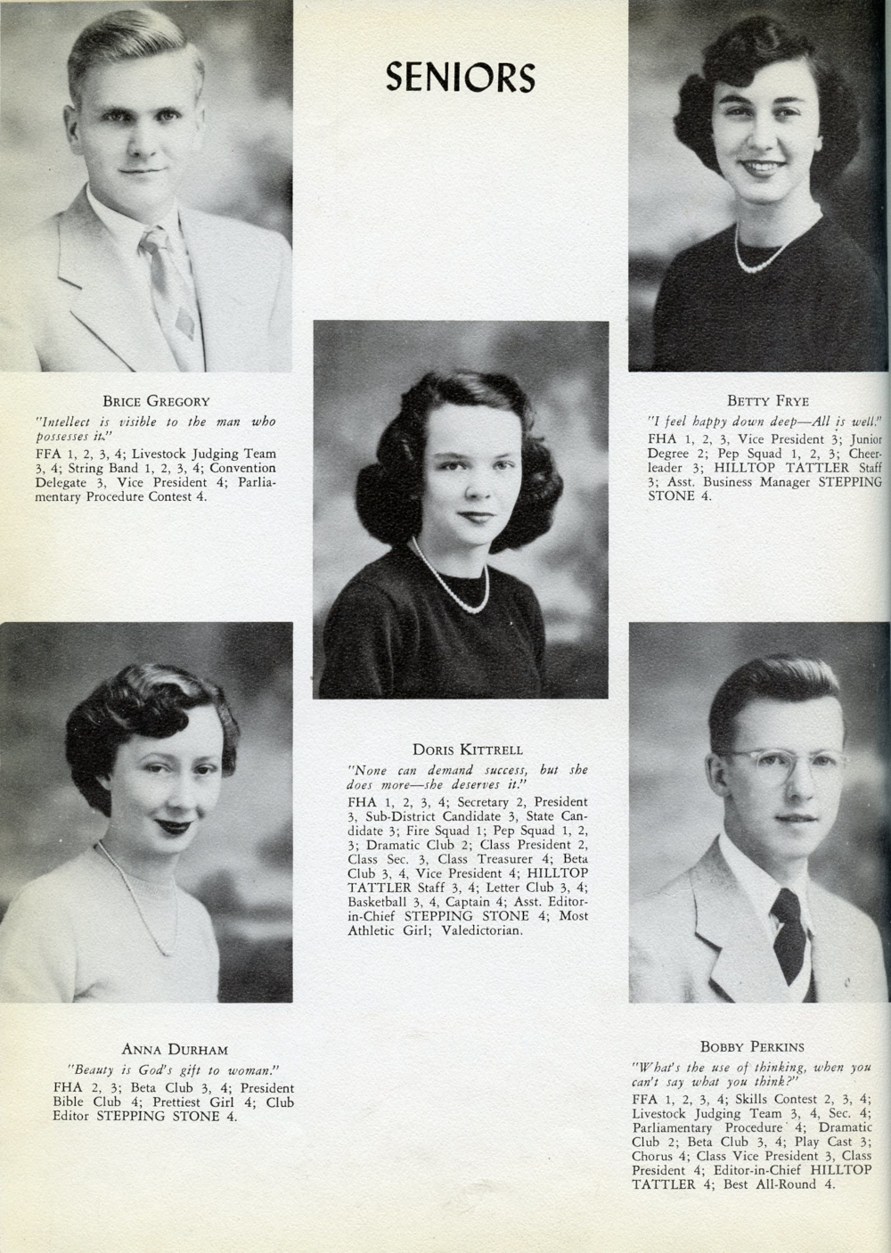 1951 Trousdale County High School, Page 14: Brice Gregory, Anna Durham, Doris Kittrell, Betty Frye, Bobby Perkins.