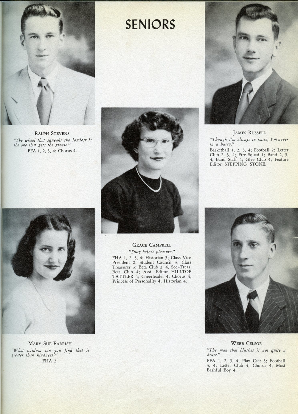 1951 Trousdale County High School, Page 17: Ralph Stevens, Mary Sue Parrish, Grace Campbell, James Russell, Webb Celsor.