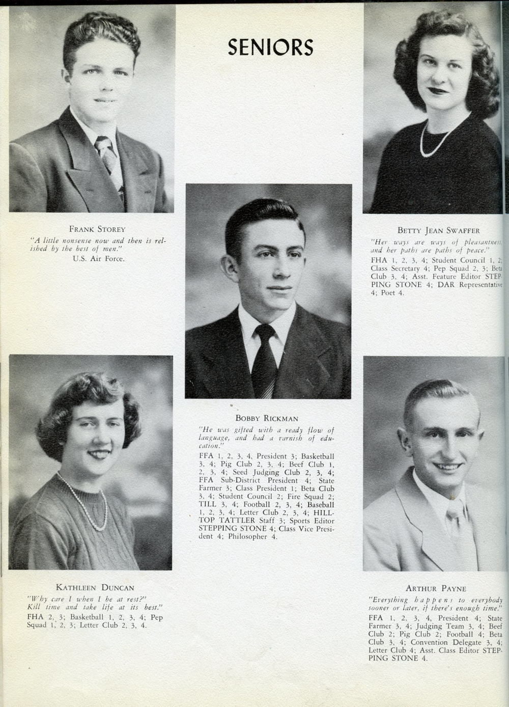 1951 Trousdale County High School, Page 18: Frank Storey, Kathleen Duncan, Bobby Rickman, Betty Jean Swaffer, Arthur Payne.