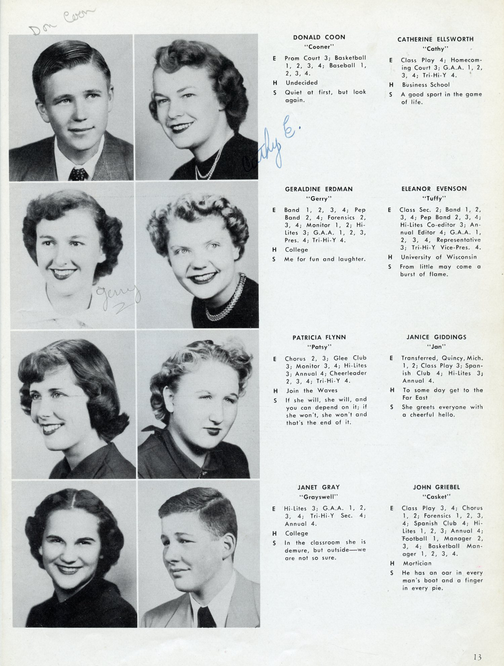 1952 Elkhorn High School Yearbook, Page 13: Donald Coon, Catherine Ellsworth, Geraldine Erdman, Eleanor Evenson, Patricia Flynn, Janice Giddings, Janet Gray, John Griebel.
