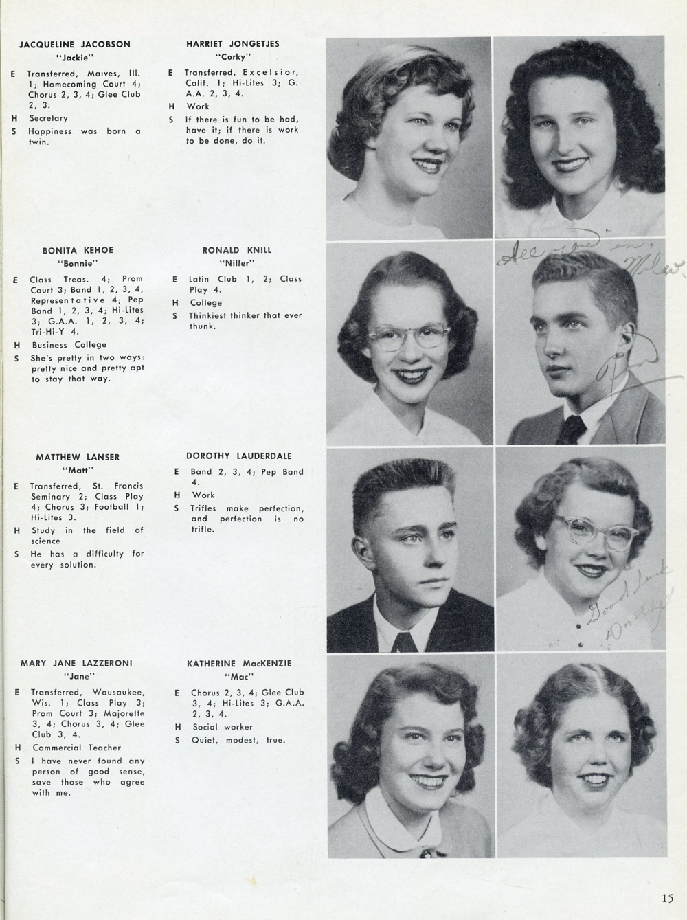 1952 Elkhorn High School Yearbook, Page 15: Jacqueline Jacobson, Harriet Jongetjes, Bonita Kehoe, Ronald Knill, Matthew Lanser, Dorothy Lauderdale, Mary Jane Lazzeroni, Katherine MacKenzie.