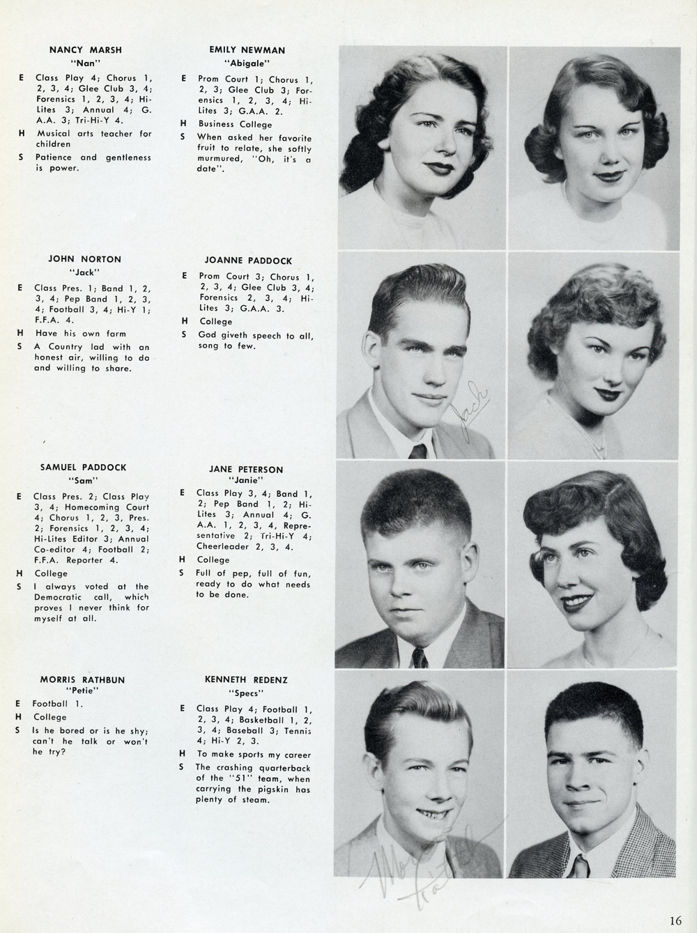 1952 Elkhorn High School Yearbook, Page 16: Nancy Marsh, Emily Newman, John Norton, Joanne Paddock, Samuel Paddock, Jane Peterson, Morris Rathbun, Kenneth Redenz.