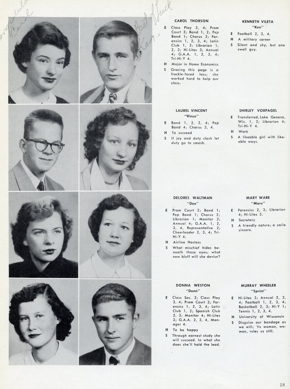 1952 Elkhorn High School Yearbook, Page 18: Carol Thorson, Kenneth Vileta, Laurel Vincent, Shirley Vorpagel, Delores Waltman, Mary Ware, Donna Weston, Murray Wheeler.