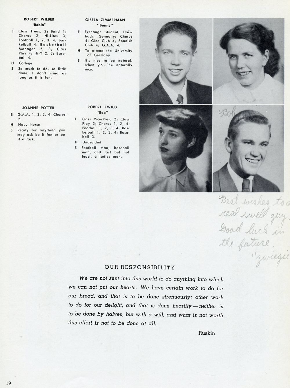 1952 Elkhorn High School Yearbook, Page 19: Robert Wilber, Gisela Zimmerman, Joanne Potter, Robert Zwieg.