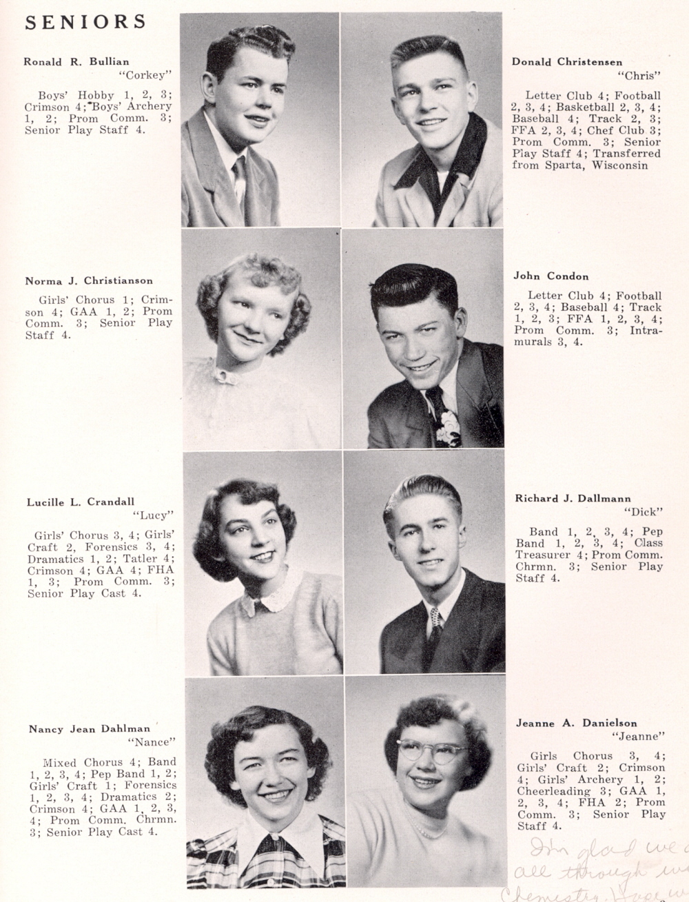 1952 Edgerton High School, Page 3: Ronald R. Bullian, Donald Christensen, Norma J. Christianson, John Condon, Lucille L. Crandall, Richard J. Dallmann, Nancy Jean Dahlman, Jeanne A. Danielson.