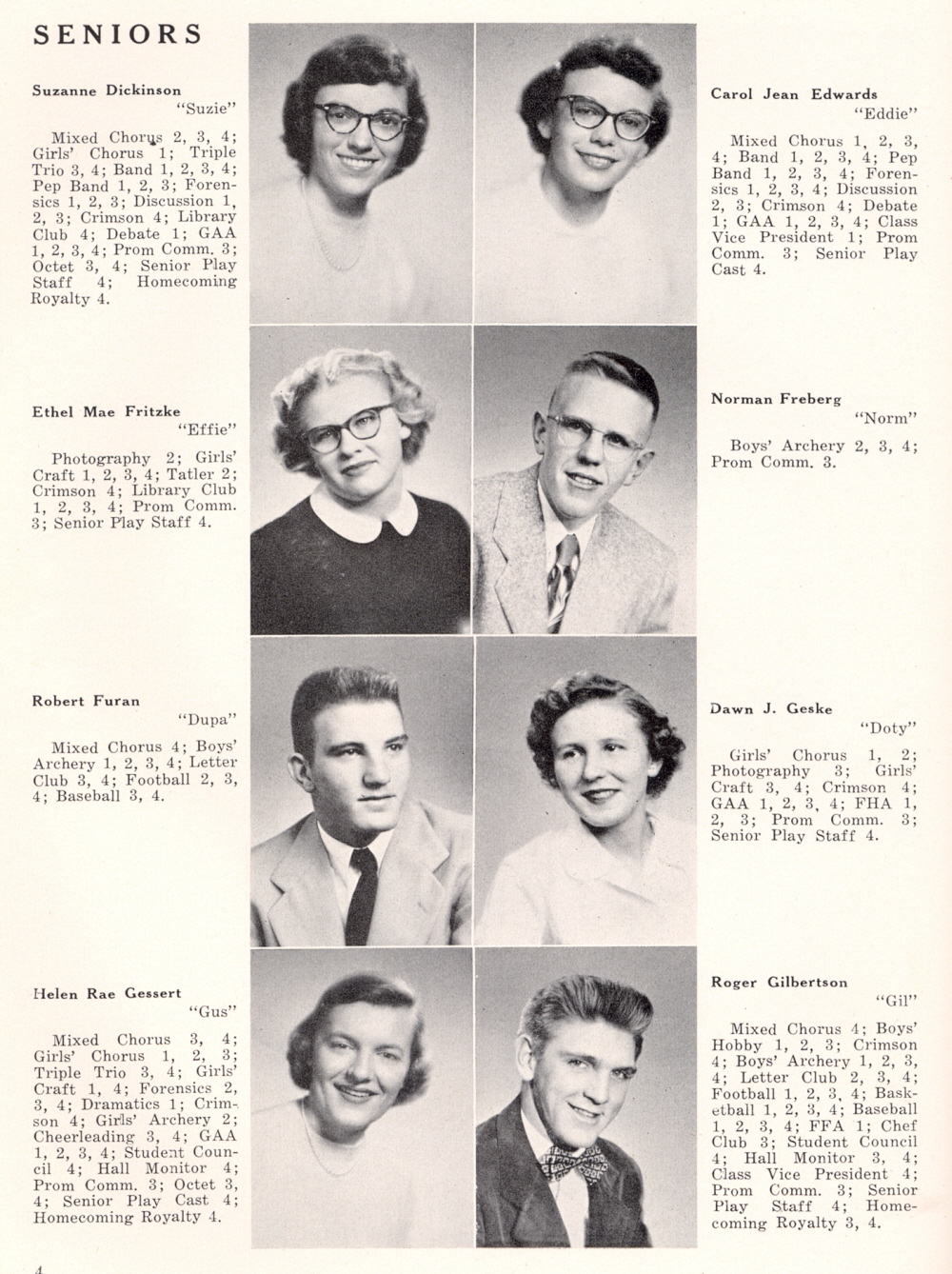1952 Edgerton High School, Page 4: Suzanne Dickinson, Carol Jean Edwards, Ethel Mae Fritzke, Norman Freberg, Robert Furan, Dawn J. Geske, Helen Rae Gessert, Roger Gilbertson.