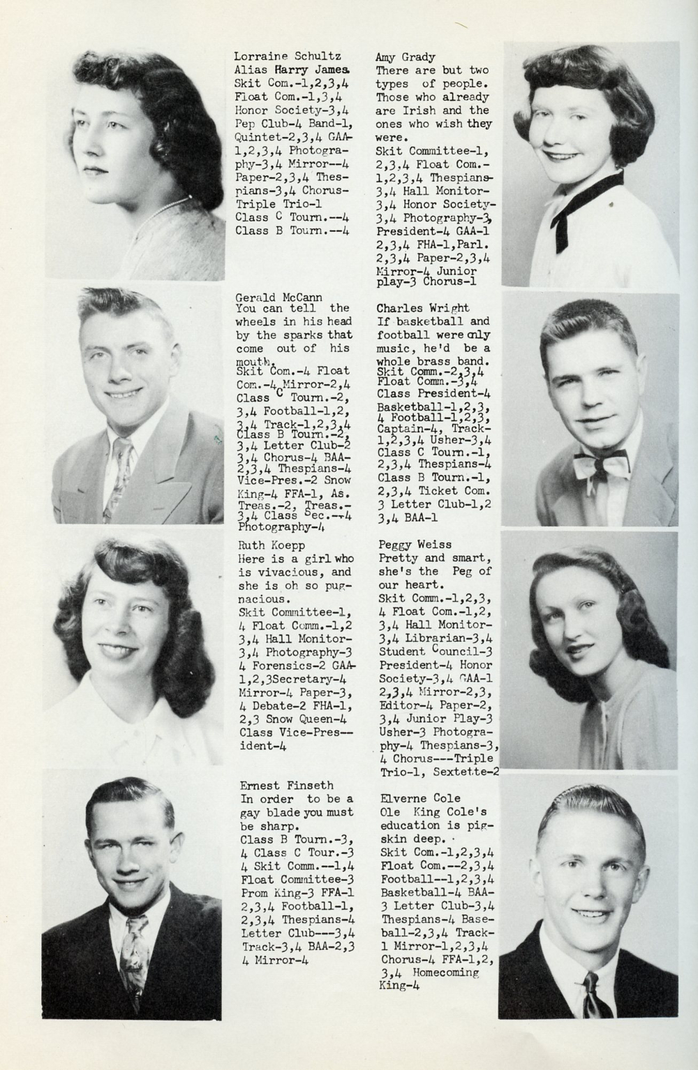 1952 Mondovi High School Yearbook Page 46: Lorraine Schultz, Gerald McCann, Ruth Koepp, Ernest Finseth, Amy Grady, Charles Wright, Peggy Weiss, Elverne Cole.