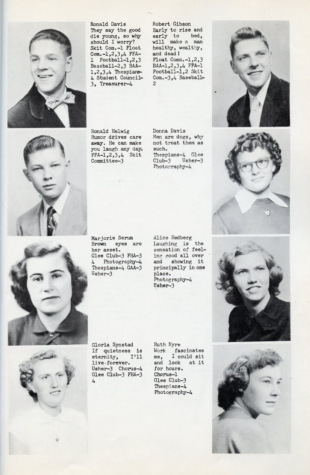 1952 Mondovi High School Yearbook Page 47: Ronald Davis, Ronald Helwig, Marjorie Serum, Gloria Synstad, Robert Gibson, Donna Davis, Alice Hedberg, Ruth Nyre.