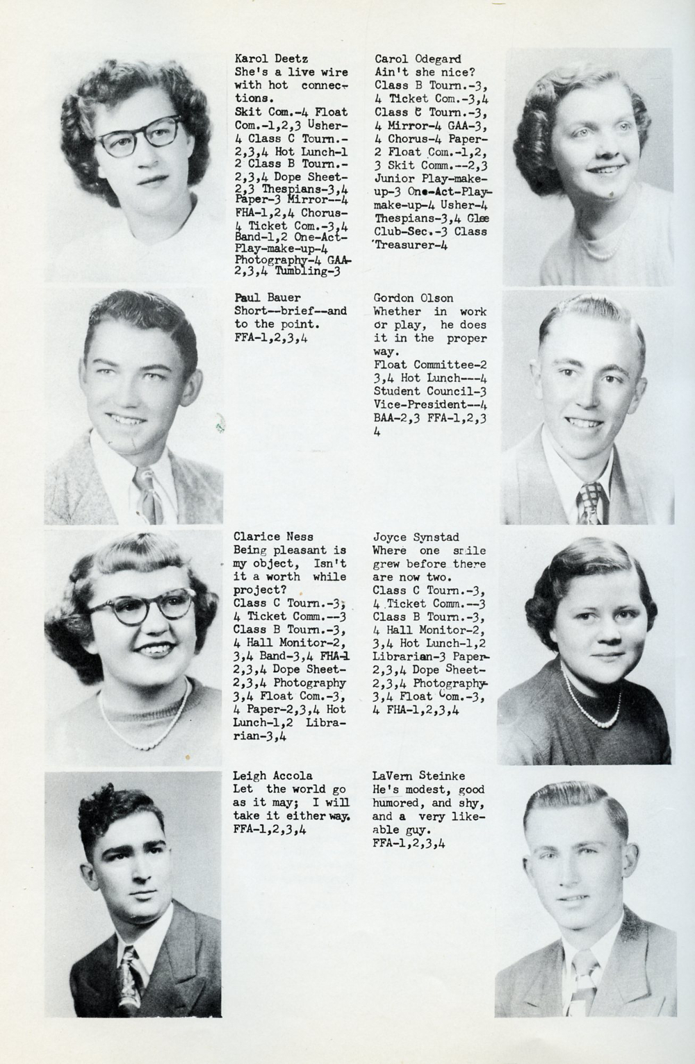 1952 Mondovi High School Yearbook Page 48: Karol Deetz, Paul Bauer, Clarice Ness, Leigh Accola, Carol Odegard, Gordon Olson, Joyce Synstad, LaVern Steinke.