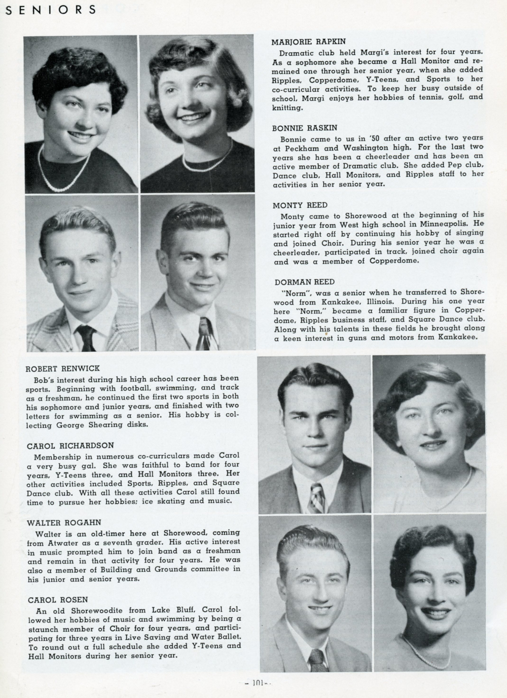 1952 Shorewood High School, Page 101: Marjorie Rapkin, Bonnie Raskin, Monty Reed, Dorman Reed, Robert Renwick, Carol Richardson, Walter Rogahn, Carol Rosen.