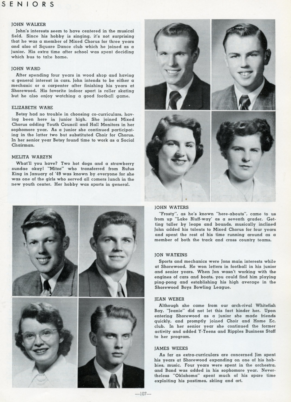 1952 Shorewood High School, Page 107: John Walker, John Ward, Elizabeth Ware, Melita Warzyn, John Waters, Jon Watkins, Jean Weber, James Weeks.