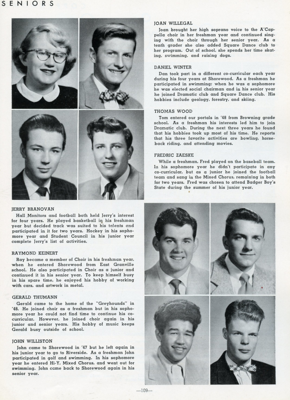 1952 Shorewood High School, Page 109: Joan Willegal, Daniel Winter, Thomas Wood, Fredric Zaeske, Jerry Branovan, Raymond Keinert, Gerald Thumann, John Williston.