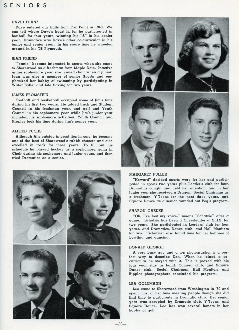 1952 Shorewood High School, Page 89: David Franz, Jean Friend, James Fromstein, Alfred Fuchs, Margaret Fuller, Sharon Gaedke, Donald George, Lea Goldmann.