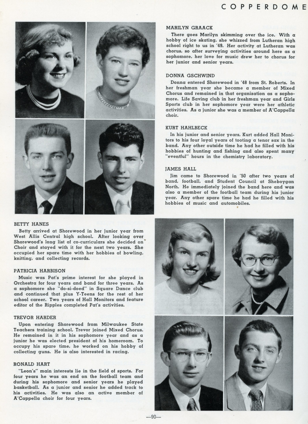 1952 Shorewood High School, Page 90: Marilyn Graack, Donna Gschwind, Kurt Hahlbeck, James Hall, Betty Hanes, Patricia Harbison, Trevor Harder, Ronald Hart.