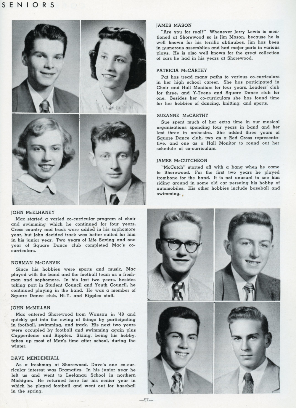 1952 Shorewood High School, Page 97: James Mason, Patricia McCarthy, Suzanne McCarthy, James McCutcheon, John McElhaney, Norman McGarvie, John McMillan, Dave Mendenhall.