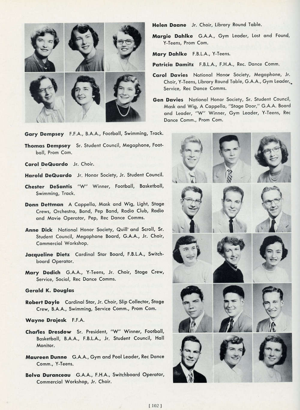 1952 Waukesha High School, Page 102: Helen Daane, Margie Dahlke, Mary Dahlke, Patricia Dahlke, Carol Davies, Gen Davies, Gary Dempsey, Thomas Dempsey, Carol DeQuardo,