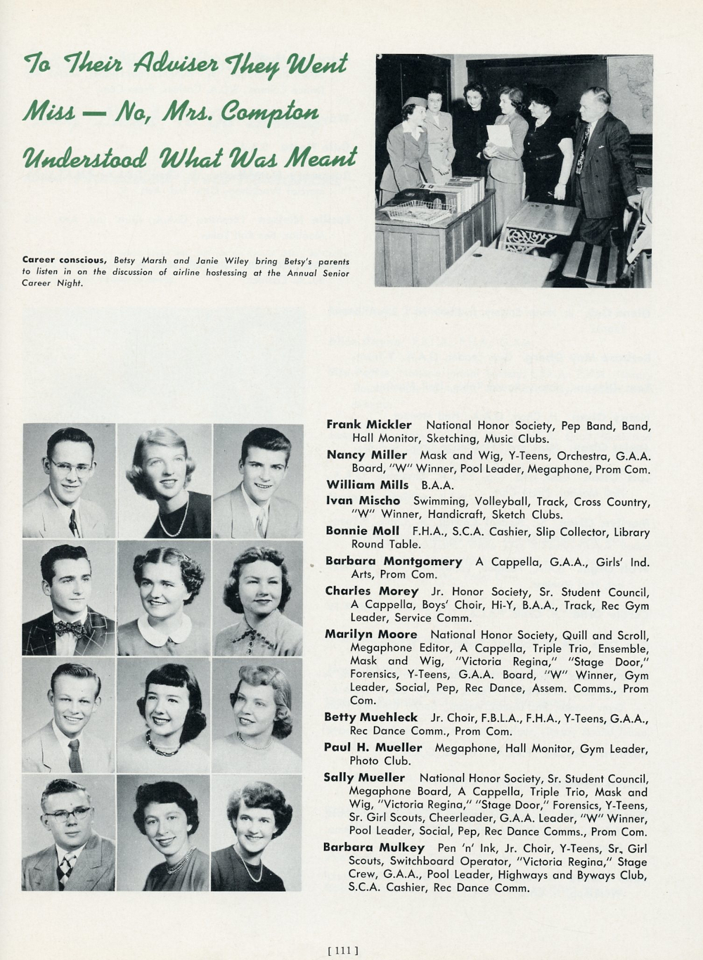 1952 Waukesha High School, Page 111: Frank Mickler, Nancy Miller, William Mills, Ivan Mischo, Bonnie Moll, Barbara Montgomery, Charles Morey, Marilyn Moore, Betty Muehleck, Paul H. Mueller, Sally Mueller, Barbara Mulkey.