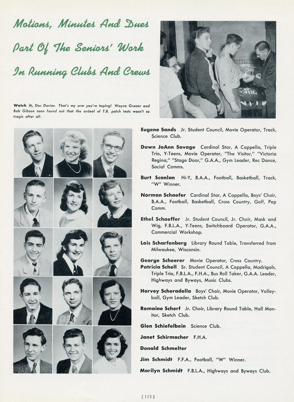 1952 Waukesha High School, Page 115: Eugene Sands, Dawn JoAnn Savage, Burt Scanlan, Norman Schaefer, Ethel Schaeffer, Lois Scharfenberg, George Scheerer,