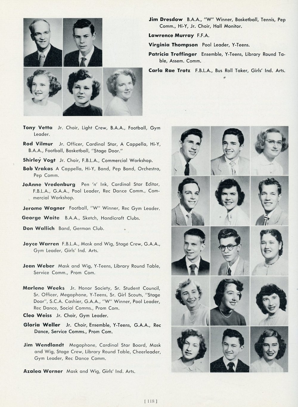 1952 Waukesha High School, Page 118: Jim Dresdow, Lawrence Murray, Virginia Thompson, Patricia Treffinger, Carla Rae Trotz, Tony Vetta, Rad Vilmur, Shirley Vogt, Bob Vrakas,