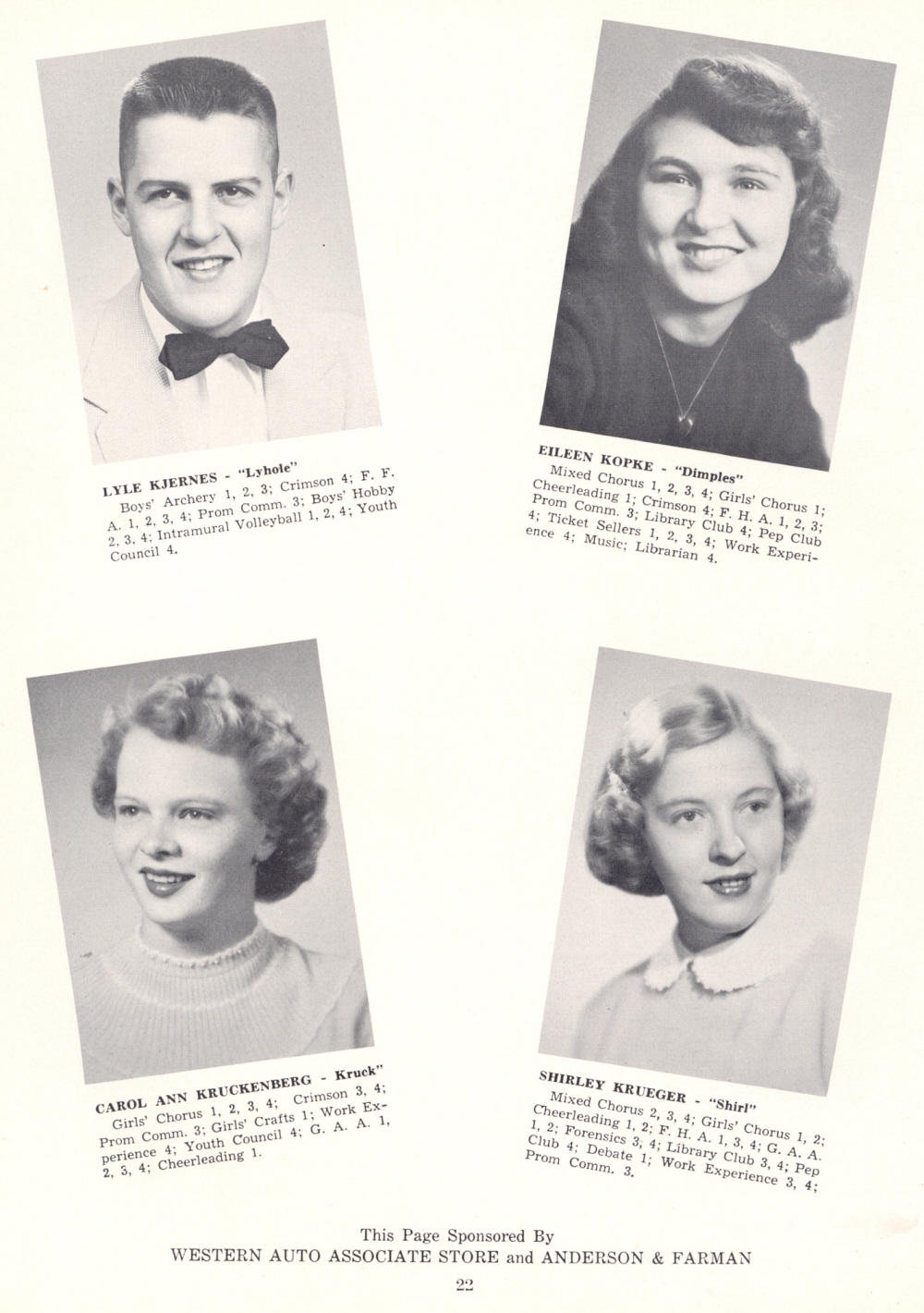 1954 Edgerton High School, Page 22: Lyle Kjernes, Eileen Kopke, Carol Ann Kruckenberg, Shirley Krueger.