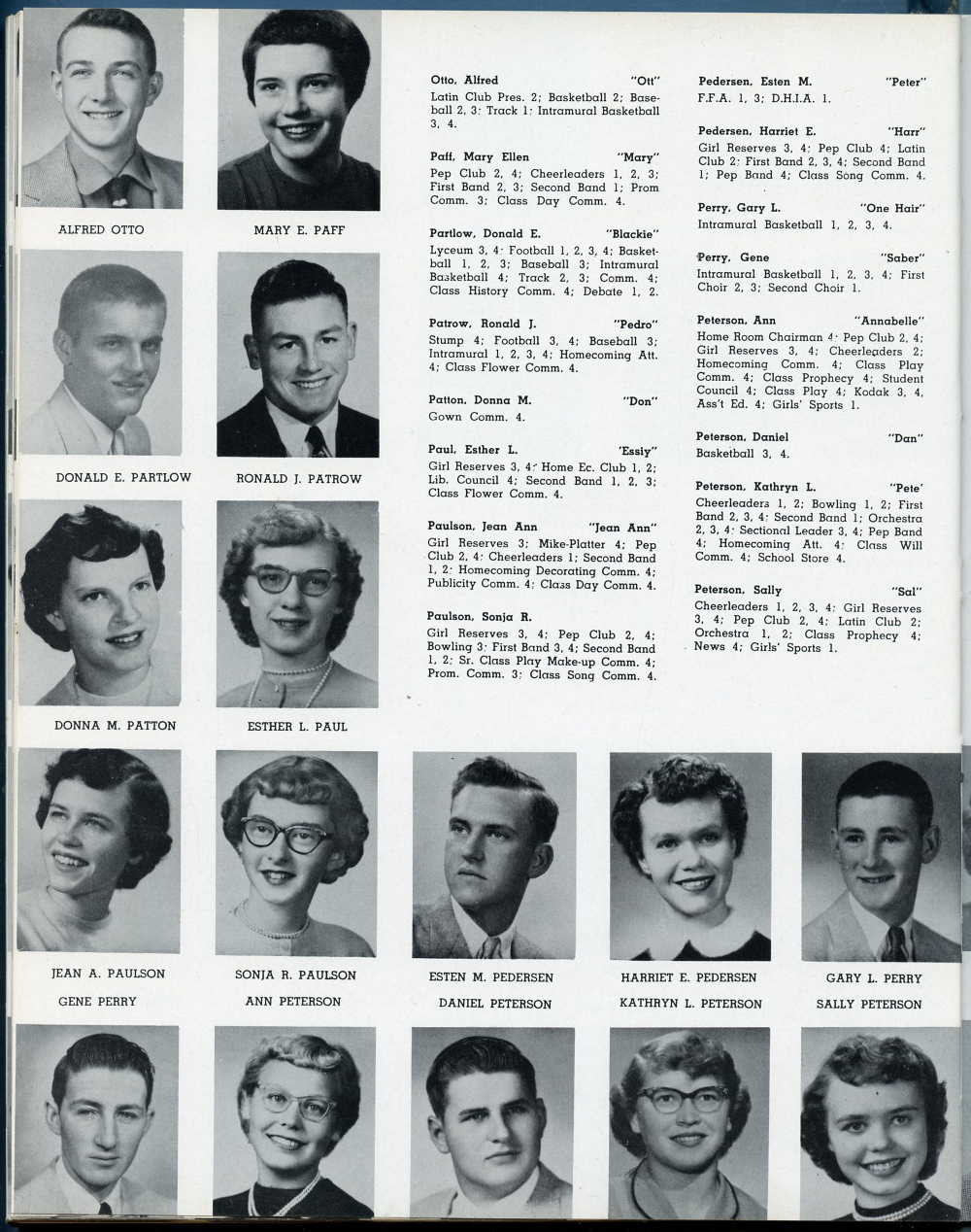 1955 Eau Claire High School, Page 158: Alfred Otto, Mary Ellen Paff, Donald E. Partlow, Ronald J. Patrow, Donna M. Patton, Esther L. Paul, Jean Ann Paulson, Sonja R. Paulson,