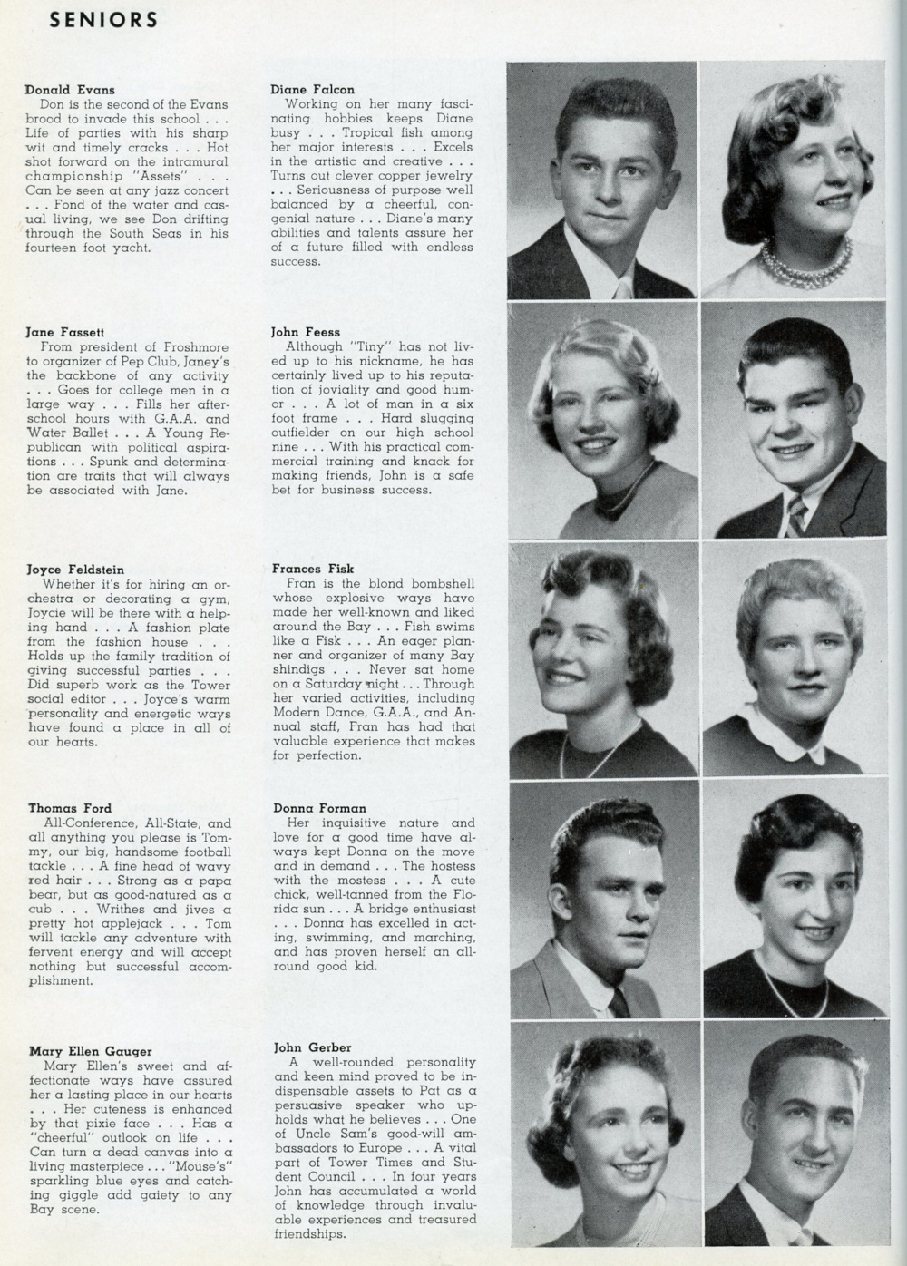 1955 Whitefish Bay High School, Page 18: Donald Evans, Diane Falcon, Jane Fassett, John Feess, Joyce Feldstein, Frances Fisk, Thomas Ford, Donna Forman, Mary Ellen Gauger, John Gerber.