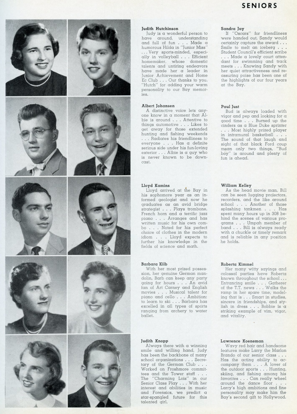 1955 Whitefish Bay High School, Page 21: Judith Hutchinson, Sandra Jay, Albert Johansen, Paul Just, Lloyd Kamins, William Kelley, Barbara Kilb, Roberta Kimmel, Judith Knopp, Lawrence Koeneman.