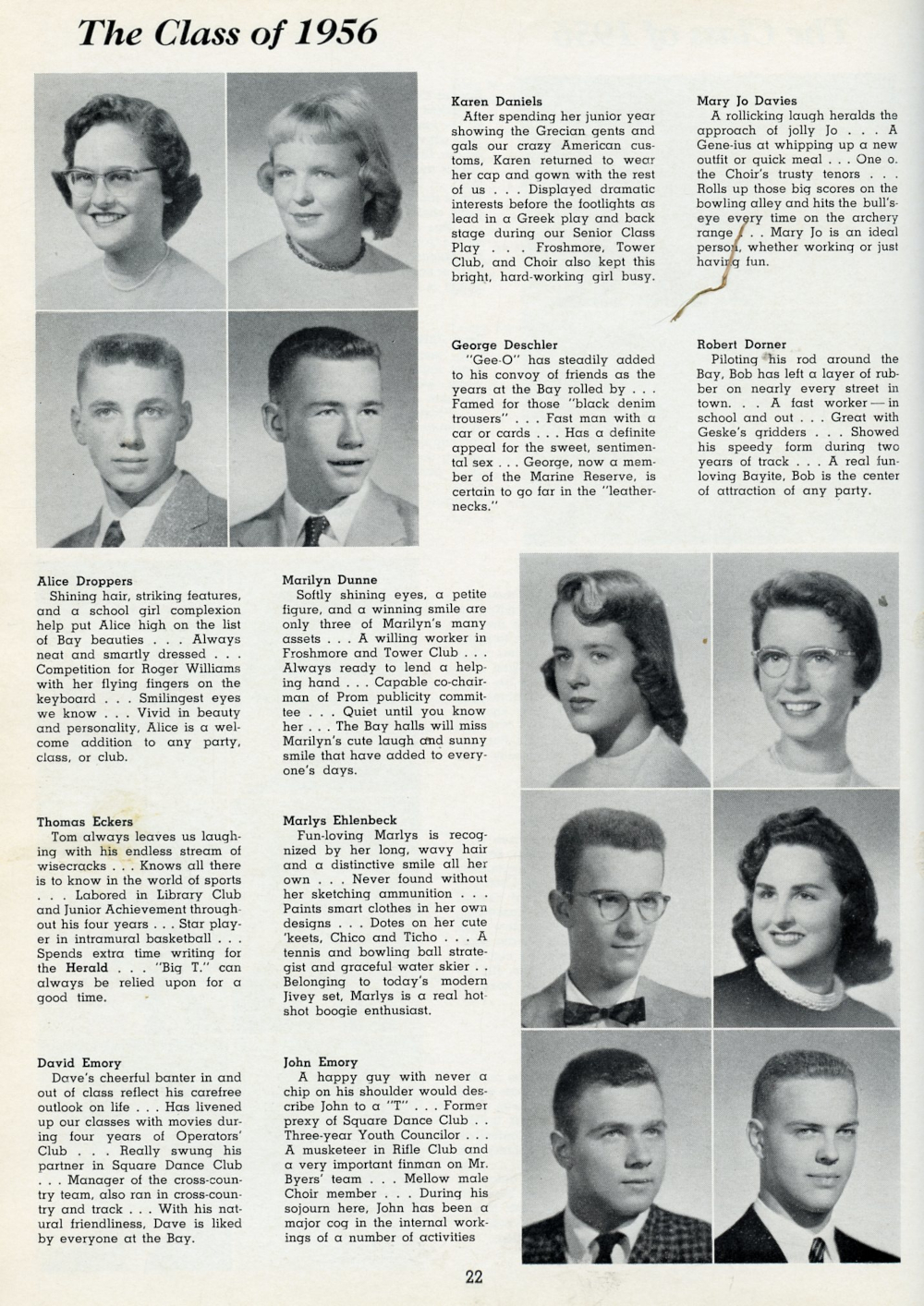 1956 Whitefish Bay High School, Page 22: Karen Daniels, Mary Jo Davies George Deschler, Robert Dorner, Alice Droppers, Marilyn Dunne, Thomas Eckers, Marlys Ehlenbeck, David Emory, John Emory.